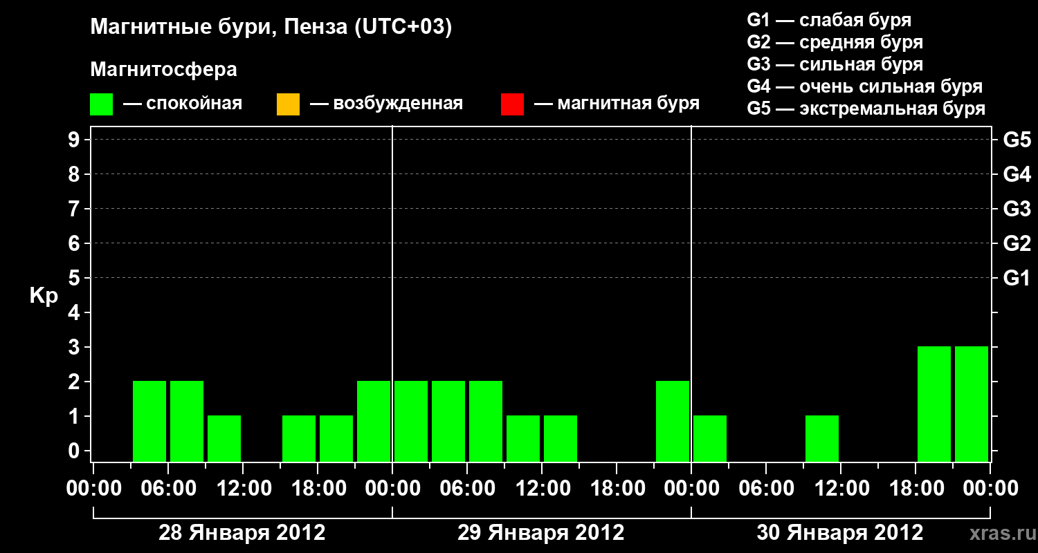 Изменения геомагнитного индекса Kp с 28 по 30 января 2012 года для средних широт