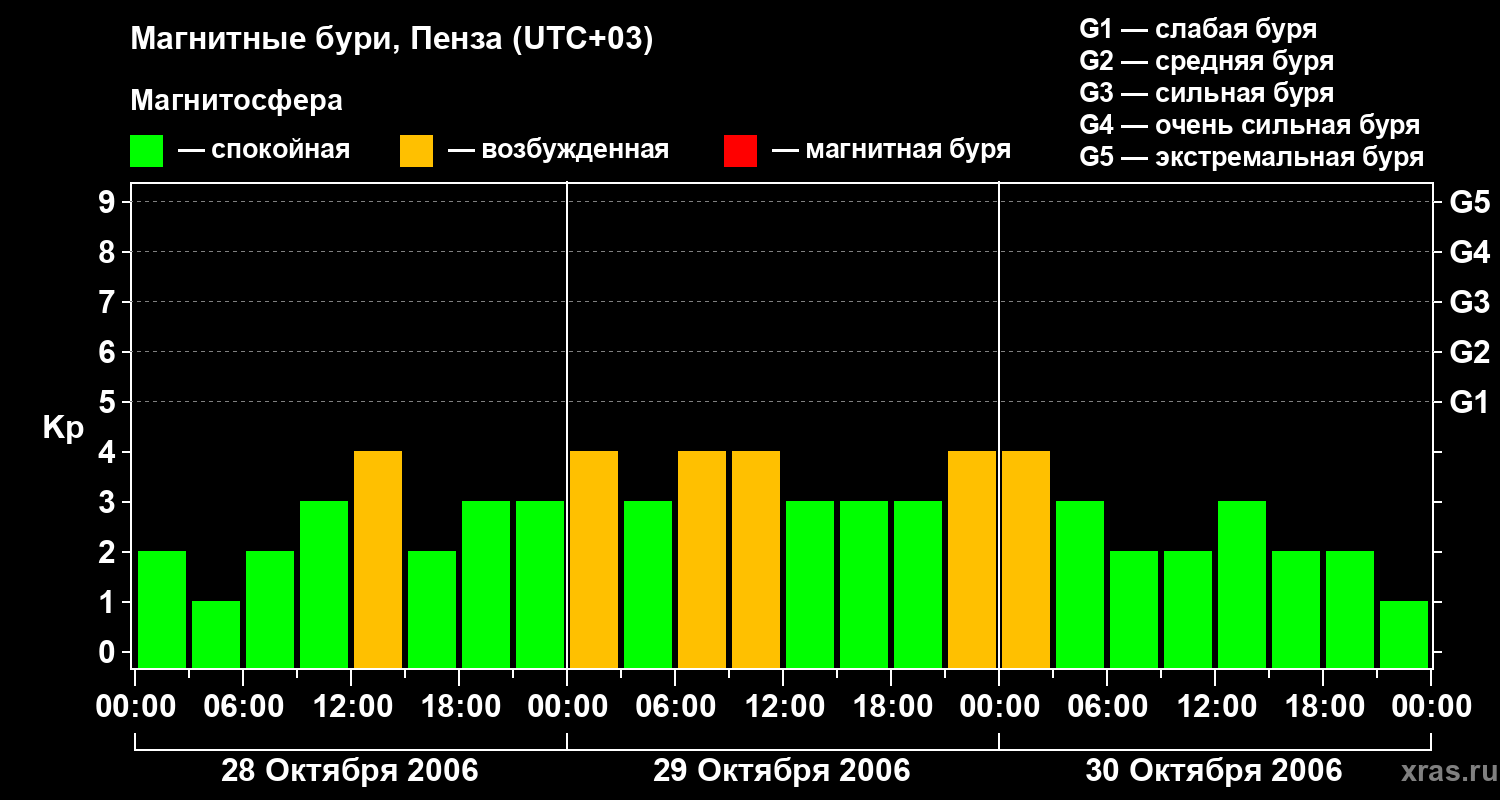 Изменения геомагнитного индекса Kp с 28 по 30 октября 2006 года для средних широт