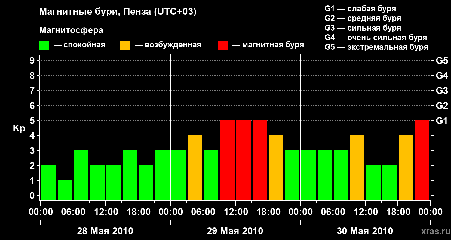 Изменения геомагнитного индекса Kp с 28 по 30 мая 2010 года для средних широт