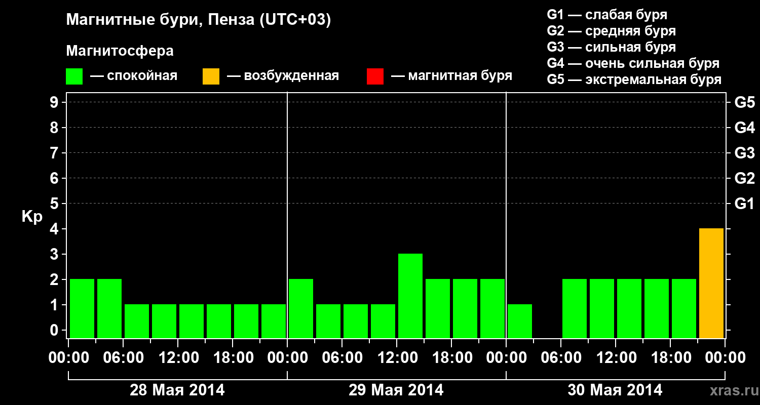 Изменения геомагнитного индекса Kp с 28 по 30 мая 2014 года для средних широт