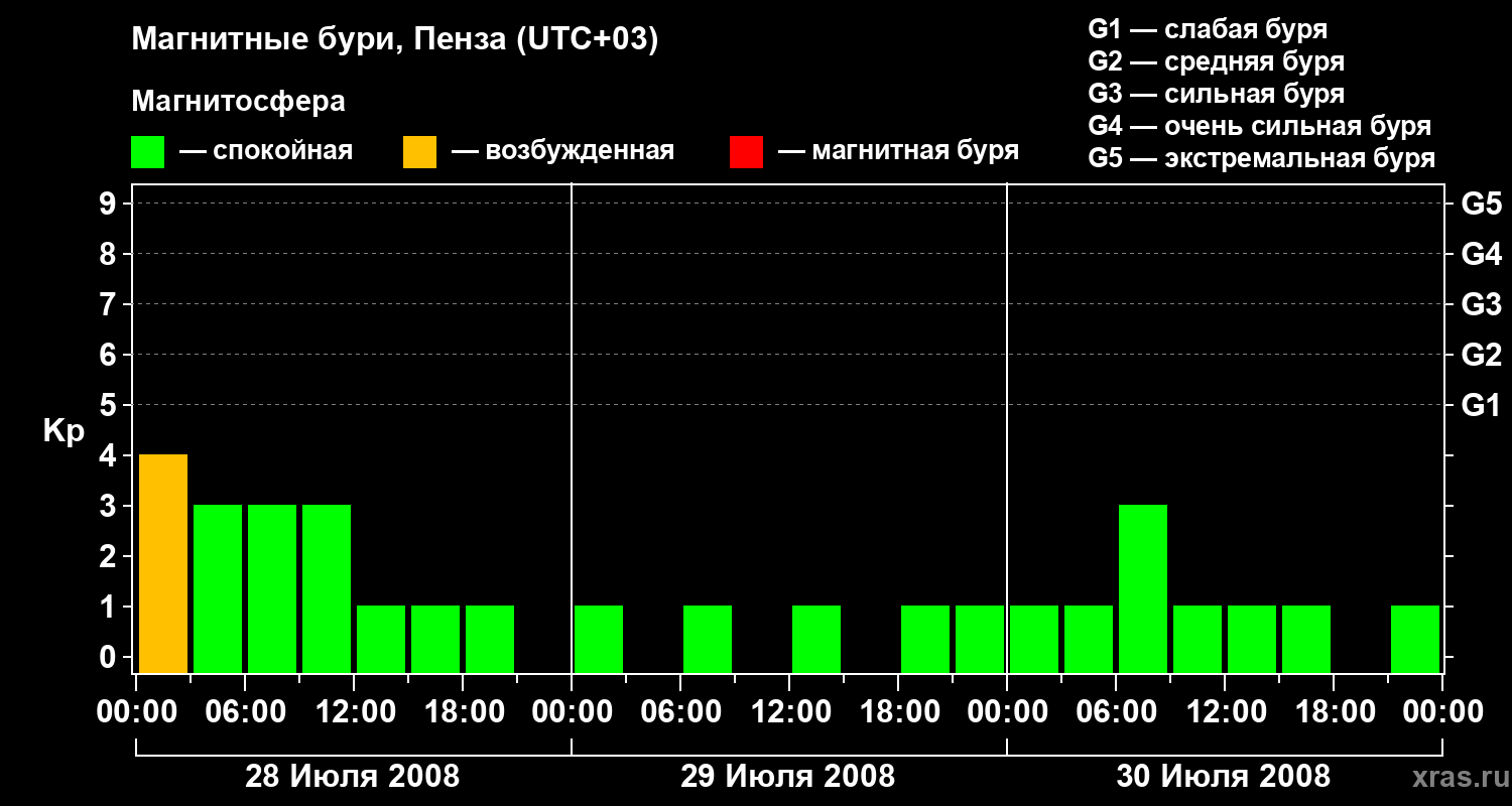 Изменения геомагнитного индекса Kp с 28 по 30 июля 2008 года для средних широт