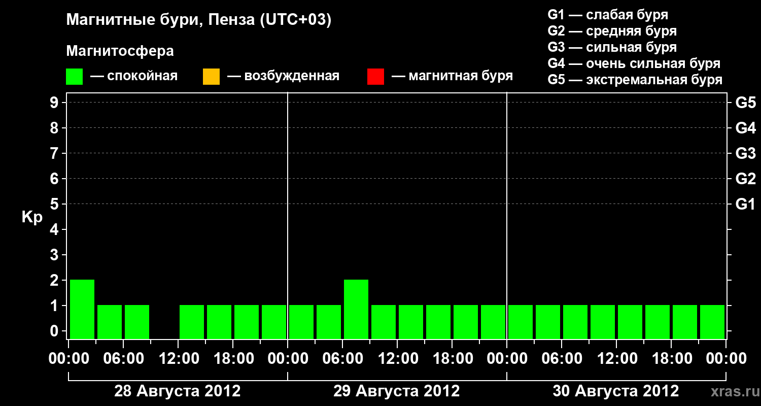 Изменения геомагнитного индекса Kp с 28 по 30 августа 2012 года для средних широт