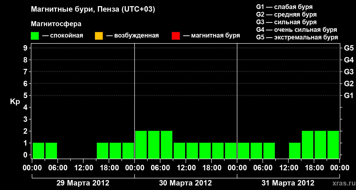 Изменения геомагнитного индекса Kp с 29 по 31 марта 2012 года для средних широт