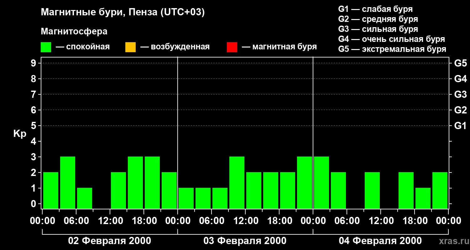 Изменения геомагнитного индекса Kp с 2 по 4 февраля 2000 года для средних широт