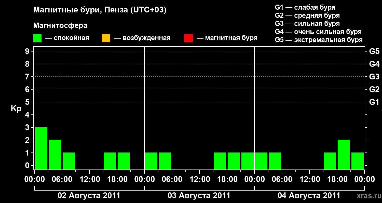 Изменения геомагнитного индекса Kp с 2 по 4 августа 2011 года для средних широт