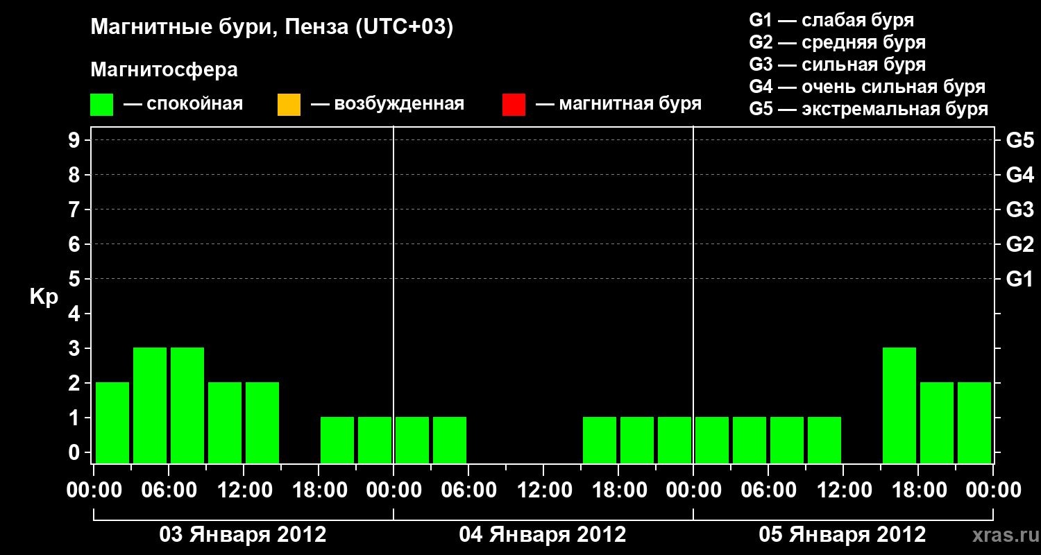Изменения геомагнитного индекса Kp с 3 по 5 января 2012 года для средних широт