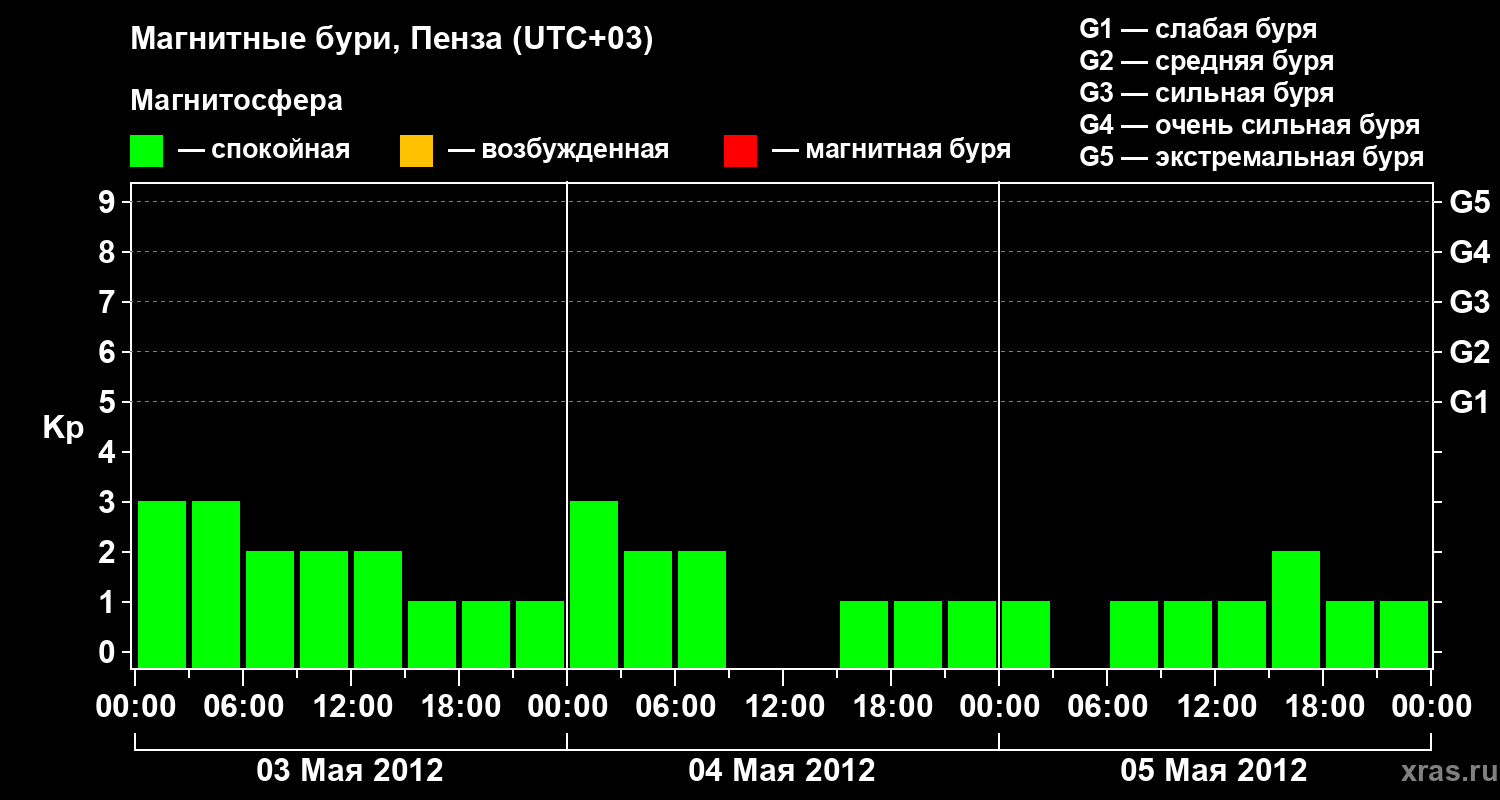 Изменения геомагнитного индекса Kp с 3 по 5 мая 2012 года для средних широт