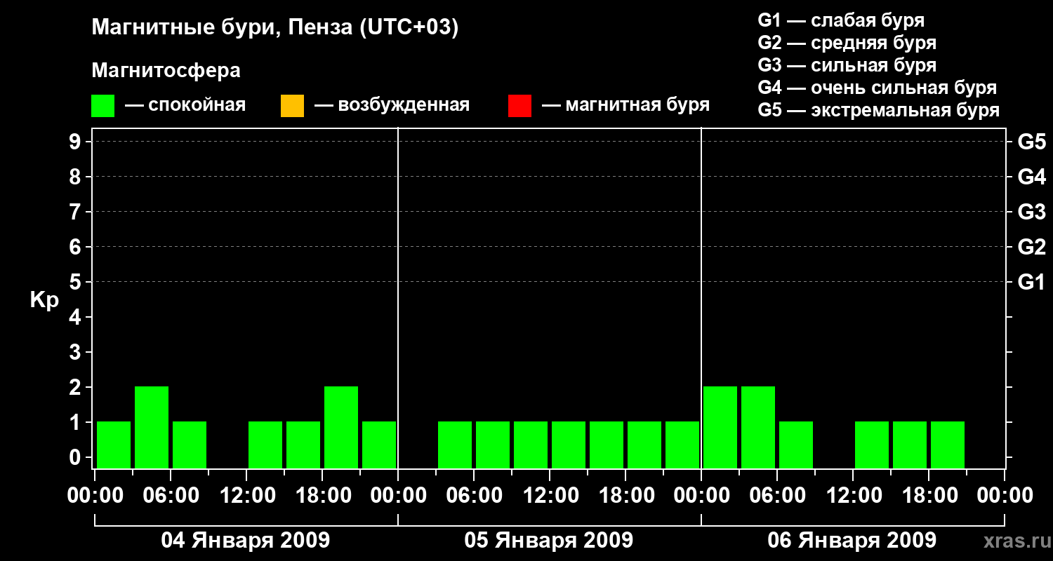 Изменения геомагнитного индекса Kp с 4 по 6 января 2009 года для средних широт