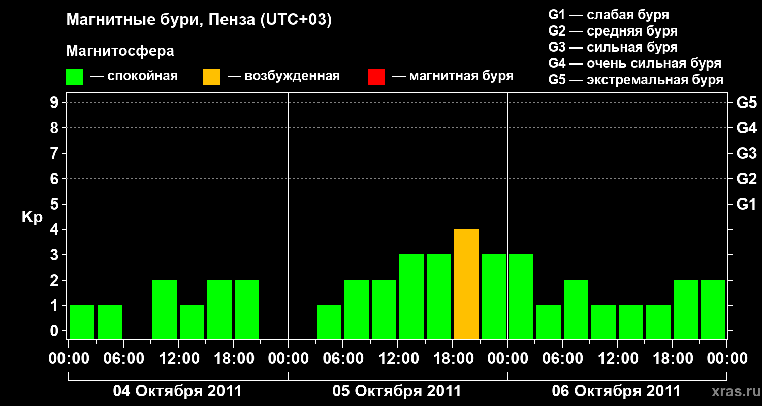 Изменения геомагнитного индекса Kp с 4 по 6 октября 2011 года для средних широт
