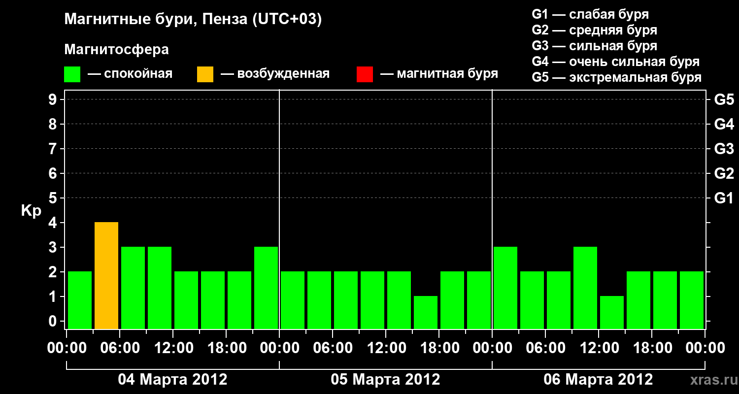 Изменения геомагнитного индекса Kp с 4 по 6 марта 2012 года для средних широт