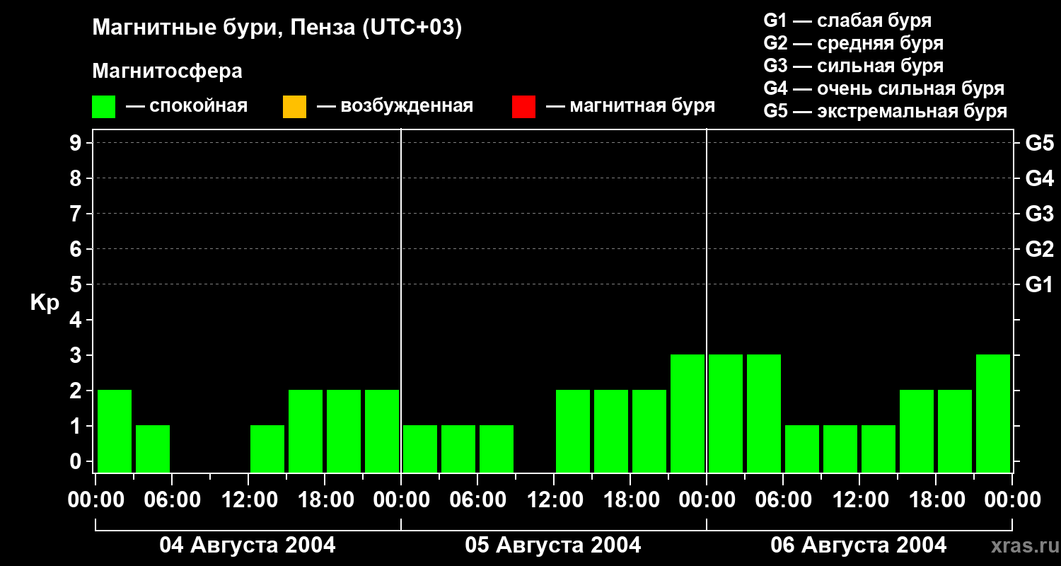 Изменения геомагнитного индекса Kp с 4 по 6 августа 2004 года для средних широт