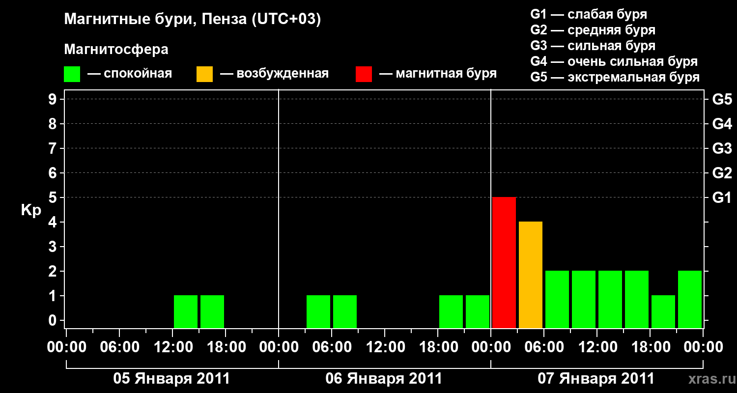 Изменения геомагнитного индекса Kp с 5 по 7 января 2011 года для средних широт