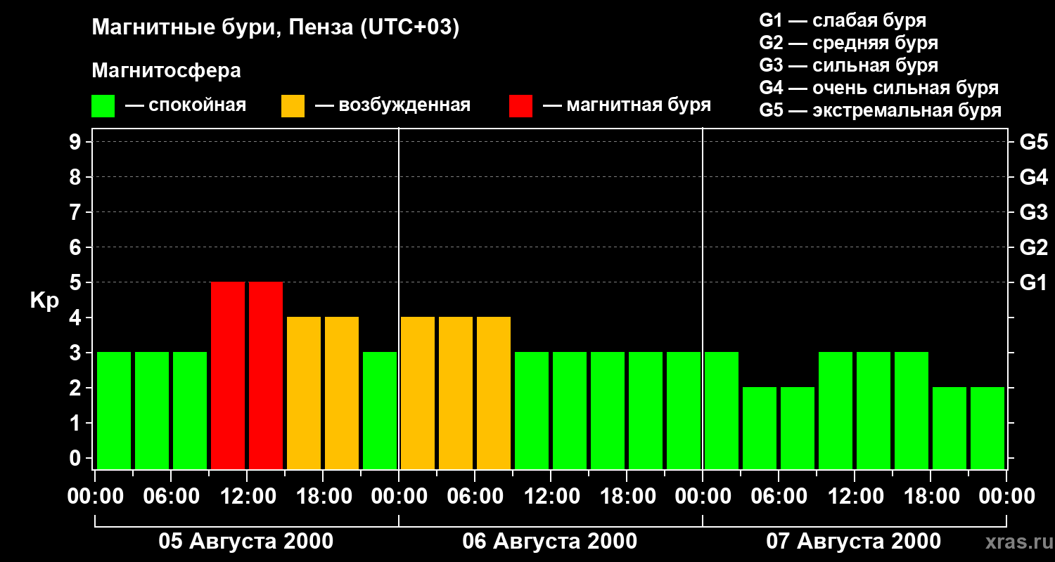 Изменения геомагнитного индекса Kp с 5 по 7 августа 2000 года для средних широт