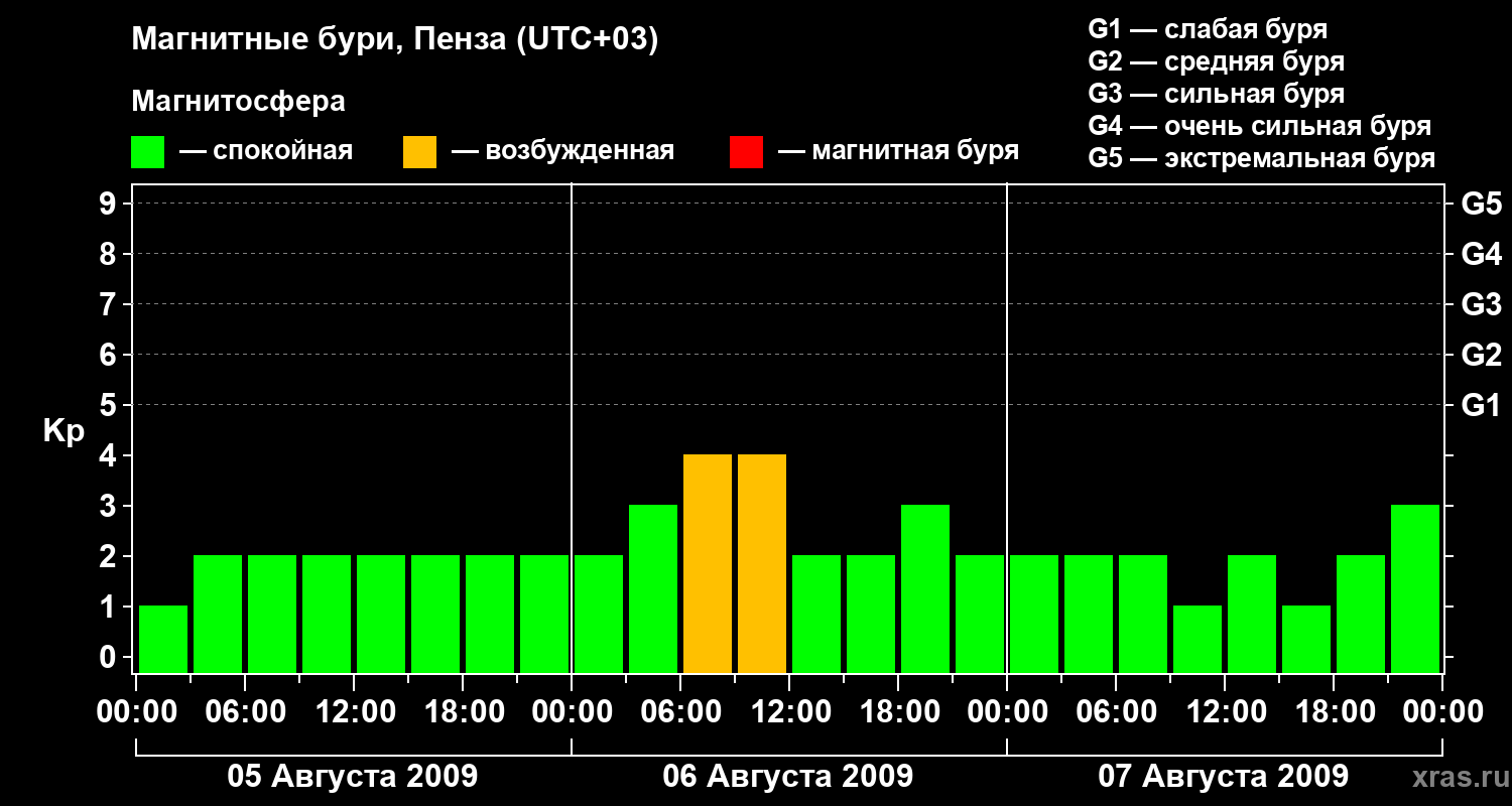 Изменения геомагнитного индекса Kp с 5 по 7 августа 2009 года для средних широт