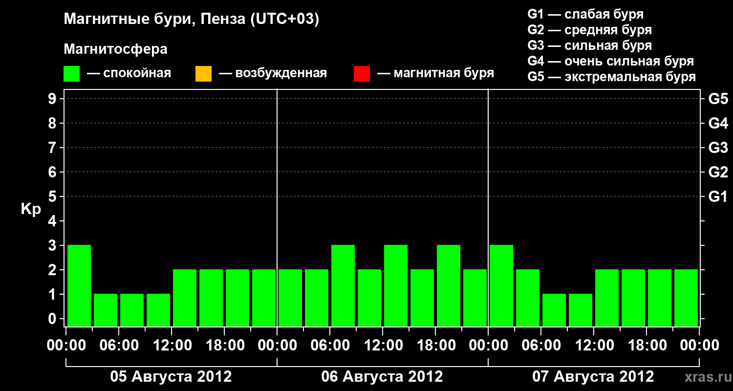 Изменения геомагнитного индекса Kp с 5 по 7 августа 2012 года для средних широт