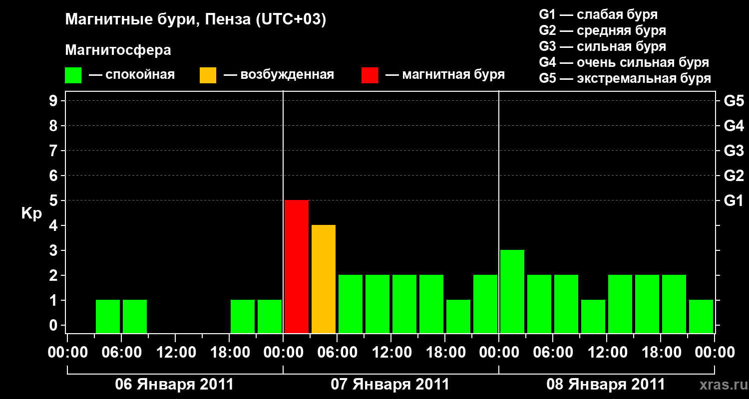 Изменения геомагнитного индекса Kp с 6 по 8 января 2011 года для средних широт
