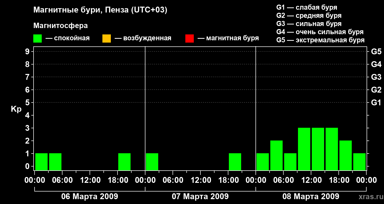 Изменения геомагнитного индекса Kp с 6 по 8 марта 2009 года для средних широт