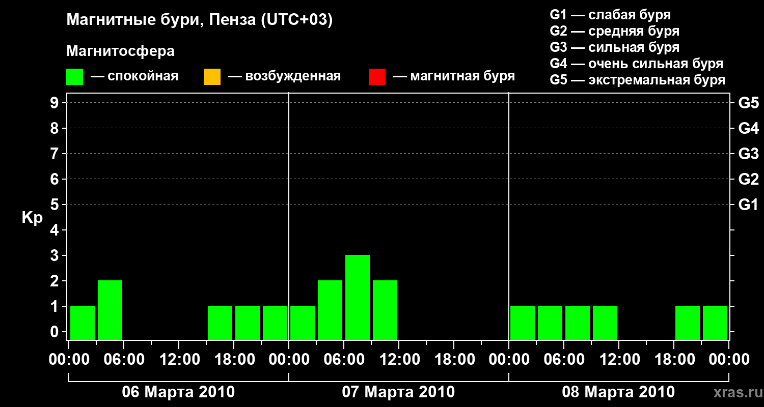Изменения геомагнитного индекса Kp с 6 по 8 марта 2010 года для средних широт