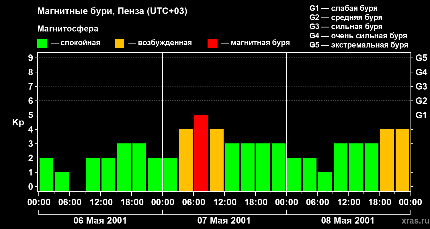 Изменения геомагнитного индекса Kp с 6 по 8 мая 2001 года для средних широт