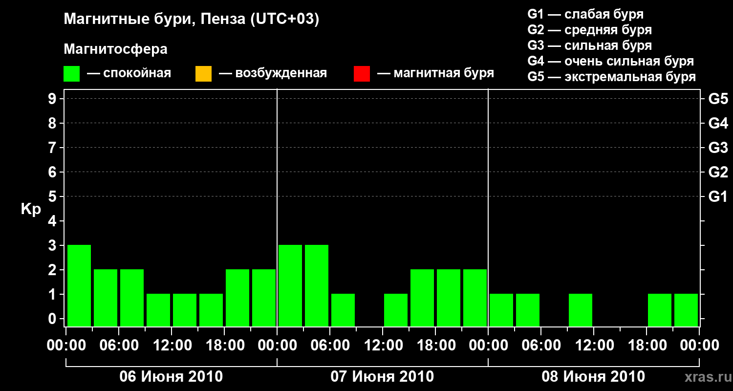 Изменения геомагнитного индекса Kp с 6 по 8 июня 2010 года для средних широт