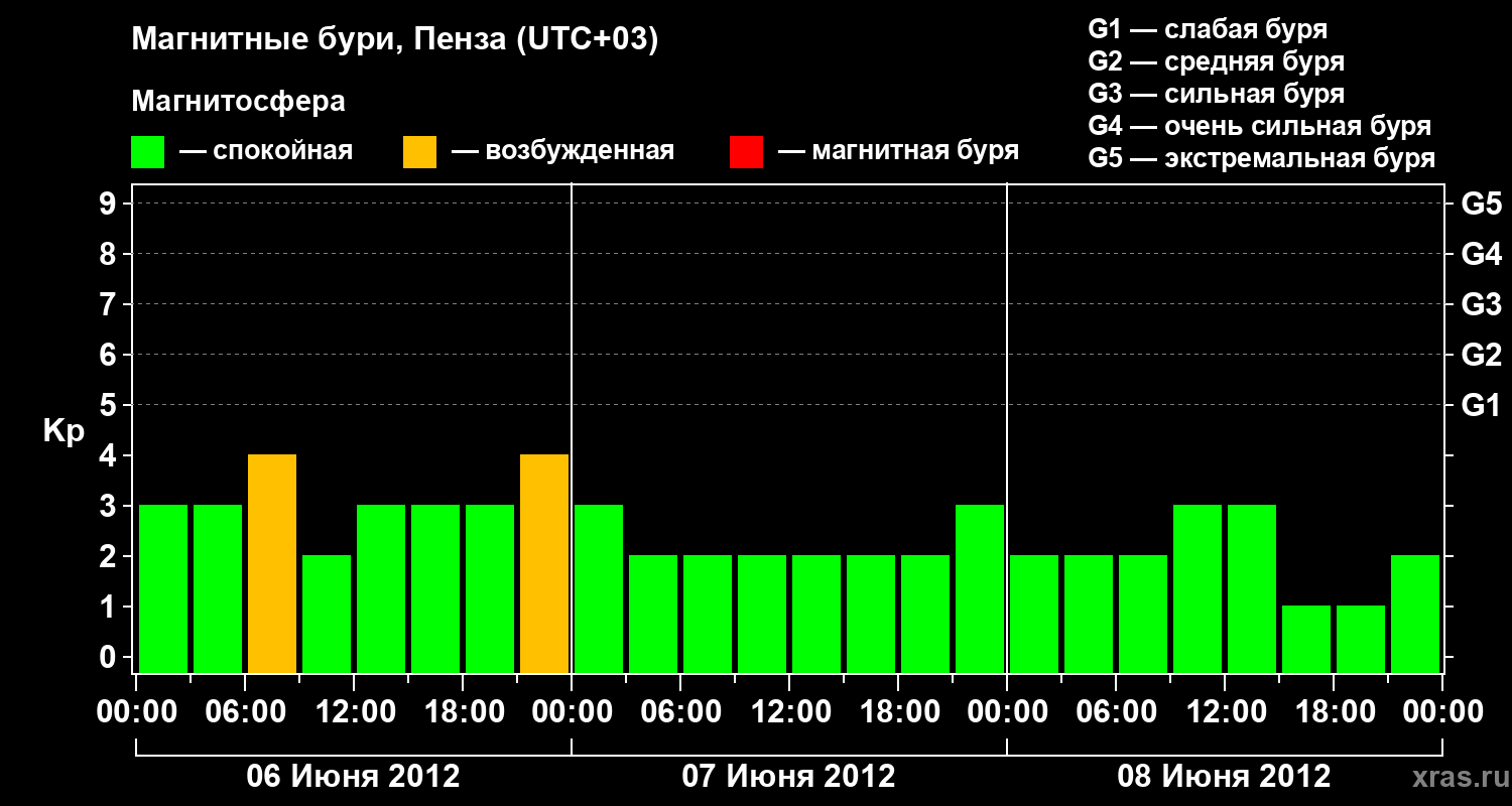 Изменения геомагнитного индекса Kp с 6 по 8 июня 2012 года для средних широт