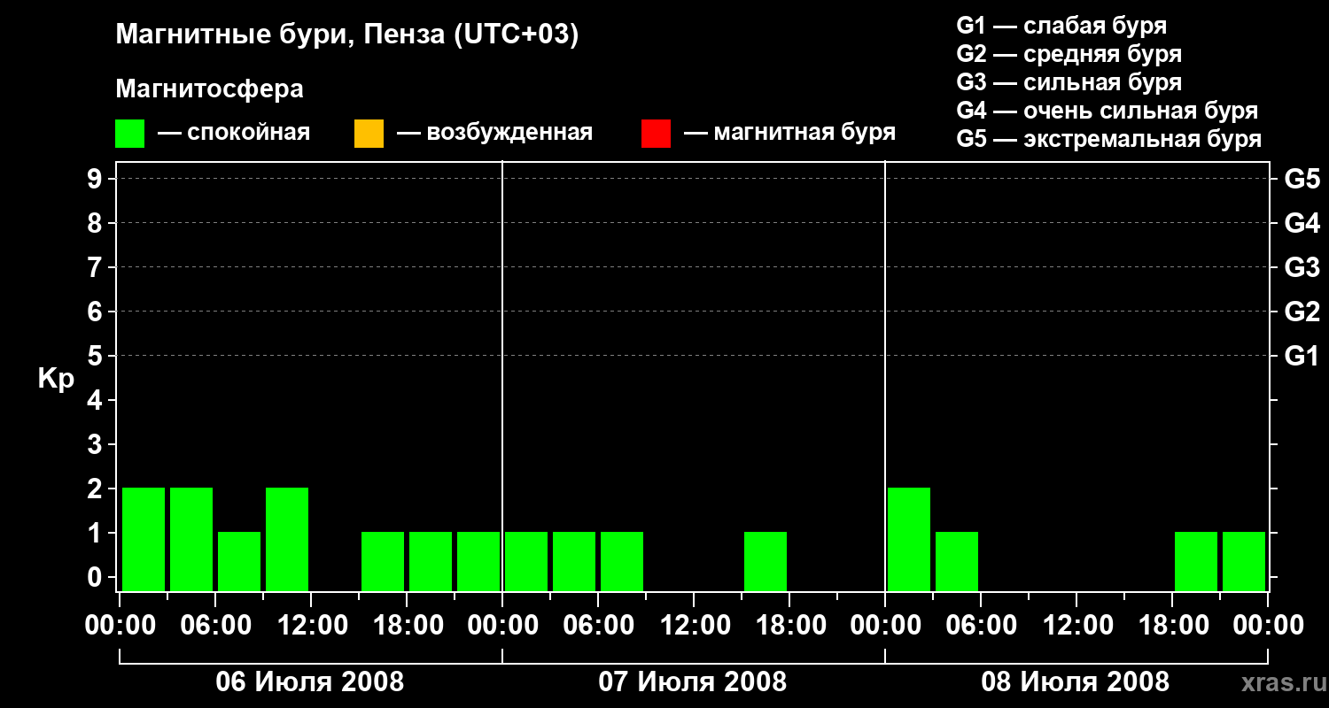 Изменения геомагнитного индекса Kp с 6 по 8 июля 2008 года для средних широт