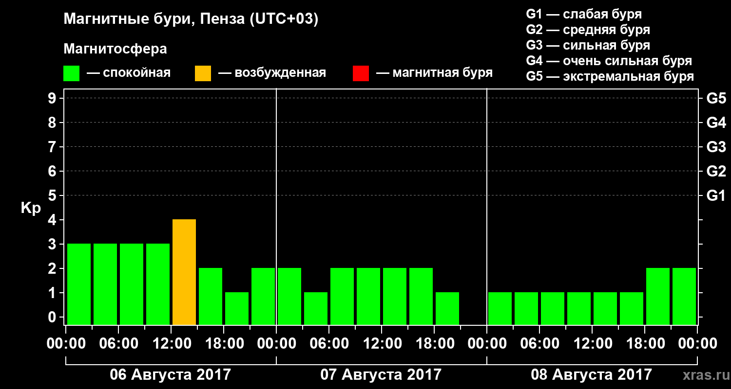 Изменения геомагнитного индекса Kp с 6 по 8 августа 2017 года для средних широт