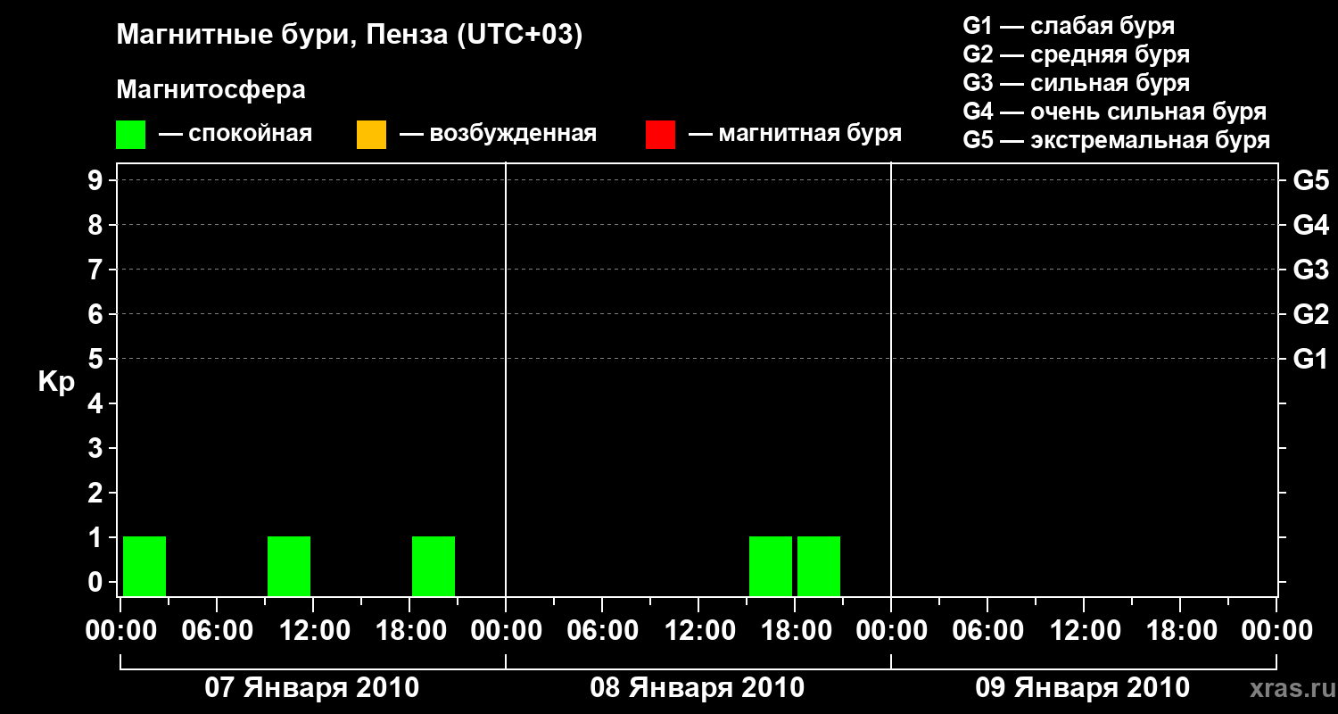 Изменения геомагнитного индекса Kp с 7 по 9 января 2010 года для средних широт