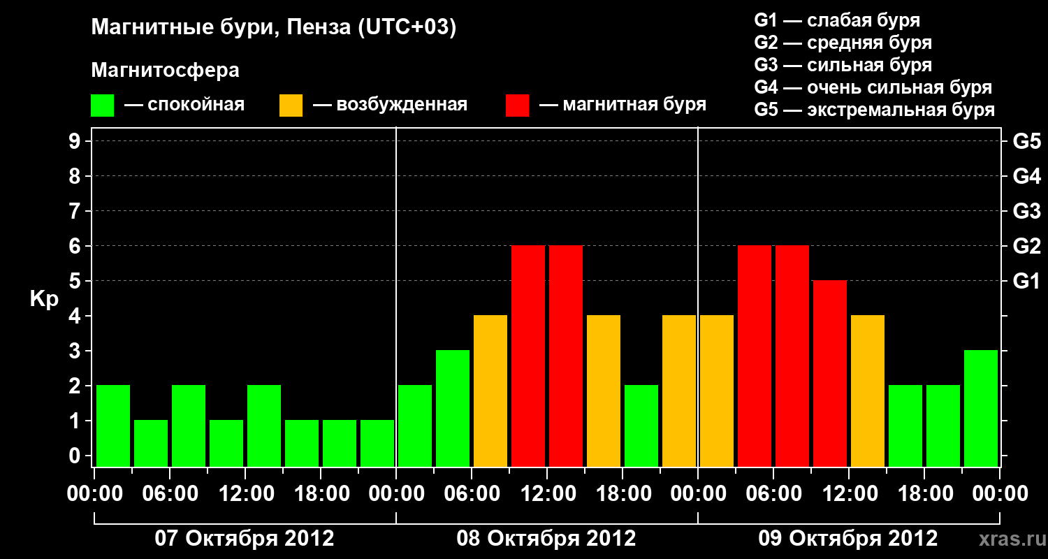 Изменения геомагнитного индекса Kp с 7 по 9 октября 2012 года для средних широт