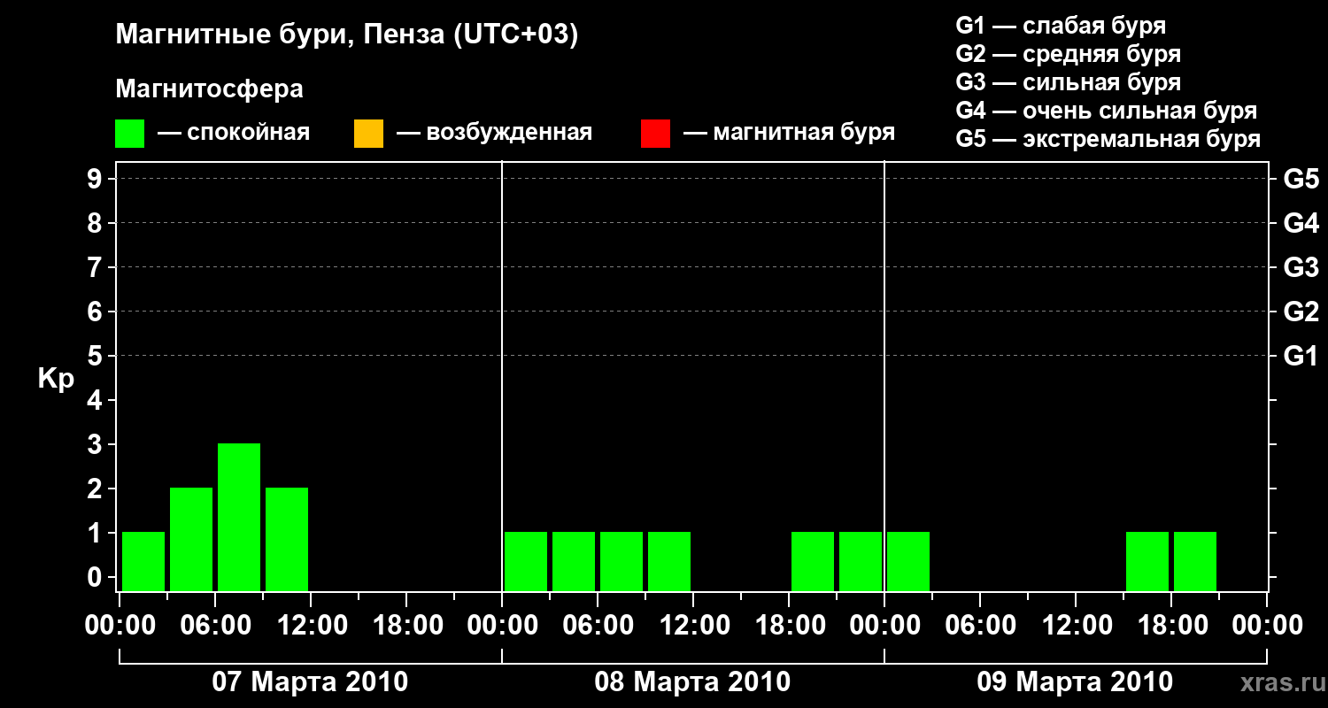 Изменения геомагнитного индекса Kp с 7 по 9 марта 2010 года для средних широт