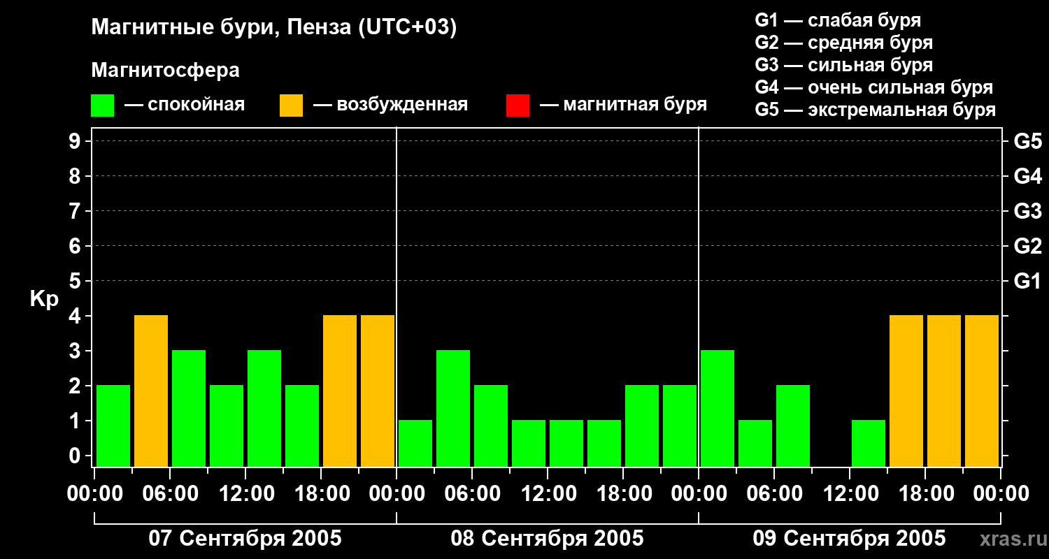 Изменения геомагнитного индекса Kp с 7 по 9 сентября 2005 года для средних широт