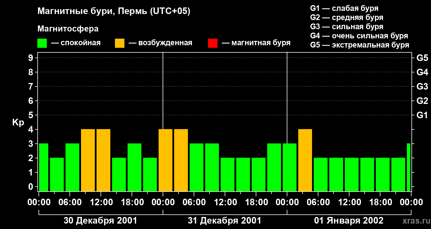 Изменения геомагнитного индекса Kp с 30 декабря 2001 года по 1 января 2002 года для средних широт