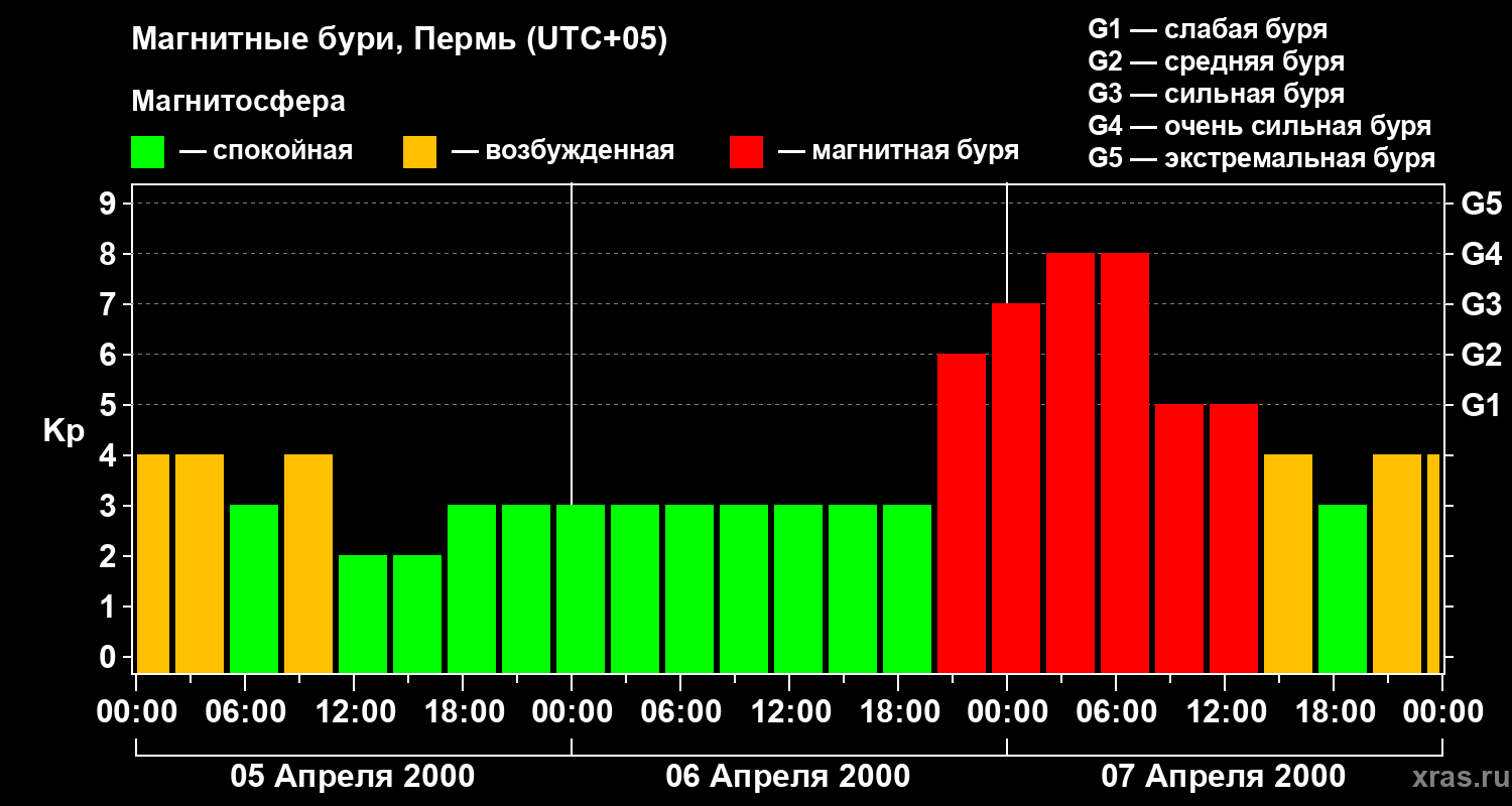 Изменения геомагнитного индекса Kp с 5 по 7 апреля 2000 года для средних широт