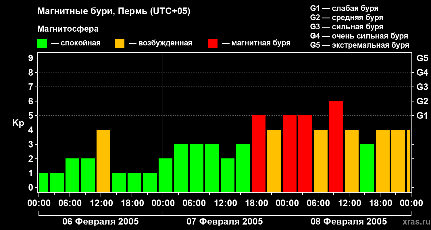 Изменения геомагнитного индекса Kp с 6 по 8 февраля 2005 года для средних широт