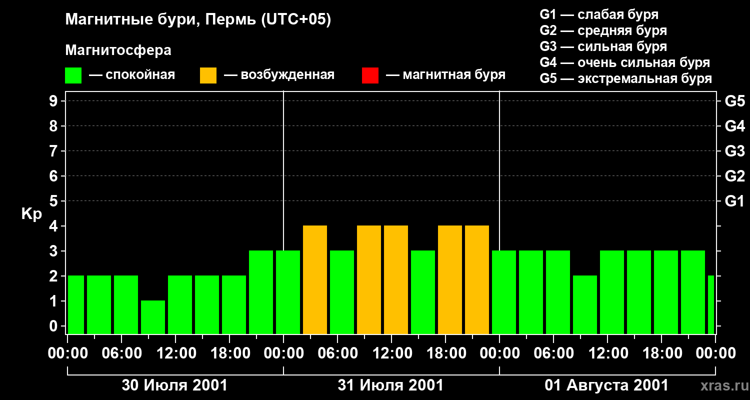 Изменения геомагнитного индекса Kp с 30 июля по 1 августа 2001 года для средних широт
