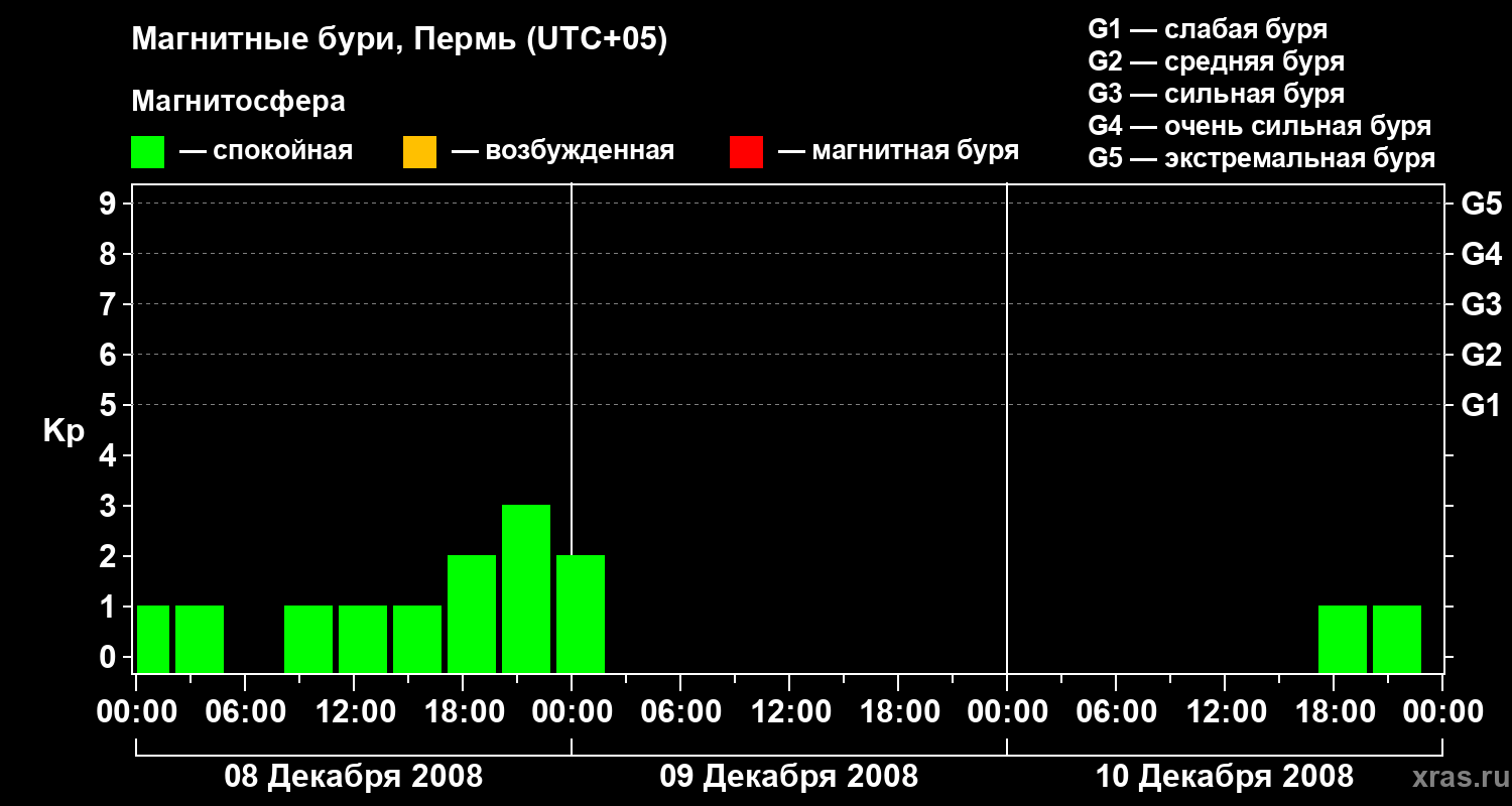 Изменения геомагнитного индекса Kp с 8 по 10 декабря 2008 года для средних широт