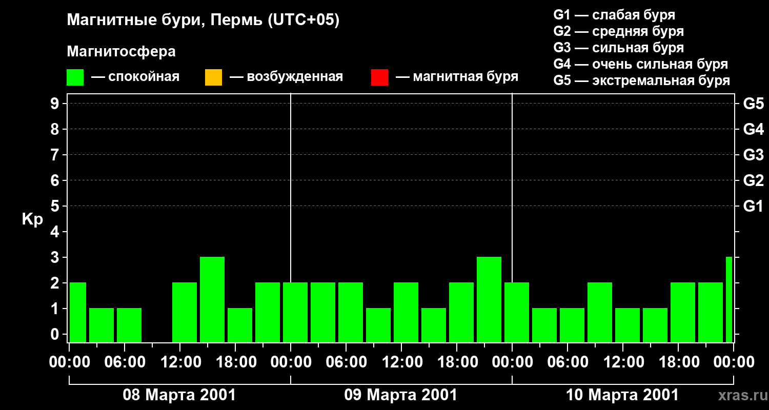 Изменения геомагнитного индекса Kp с 8 по 10 марта 2001 года для средних широт