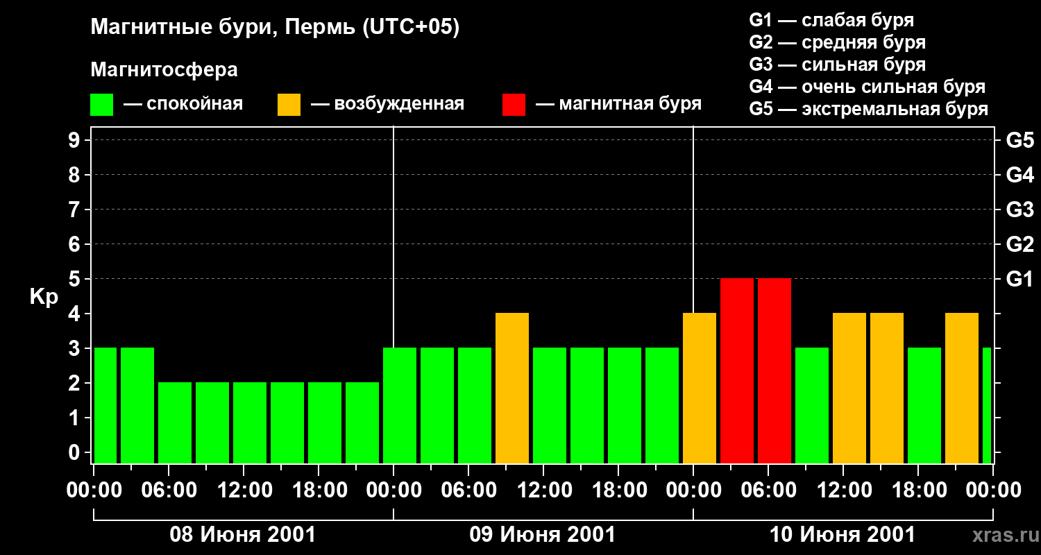 Изменения геомагнитного индекса Kp с 8 по 10 июня 2001 года для средних широт