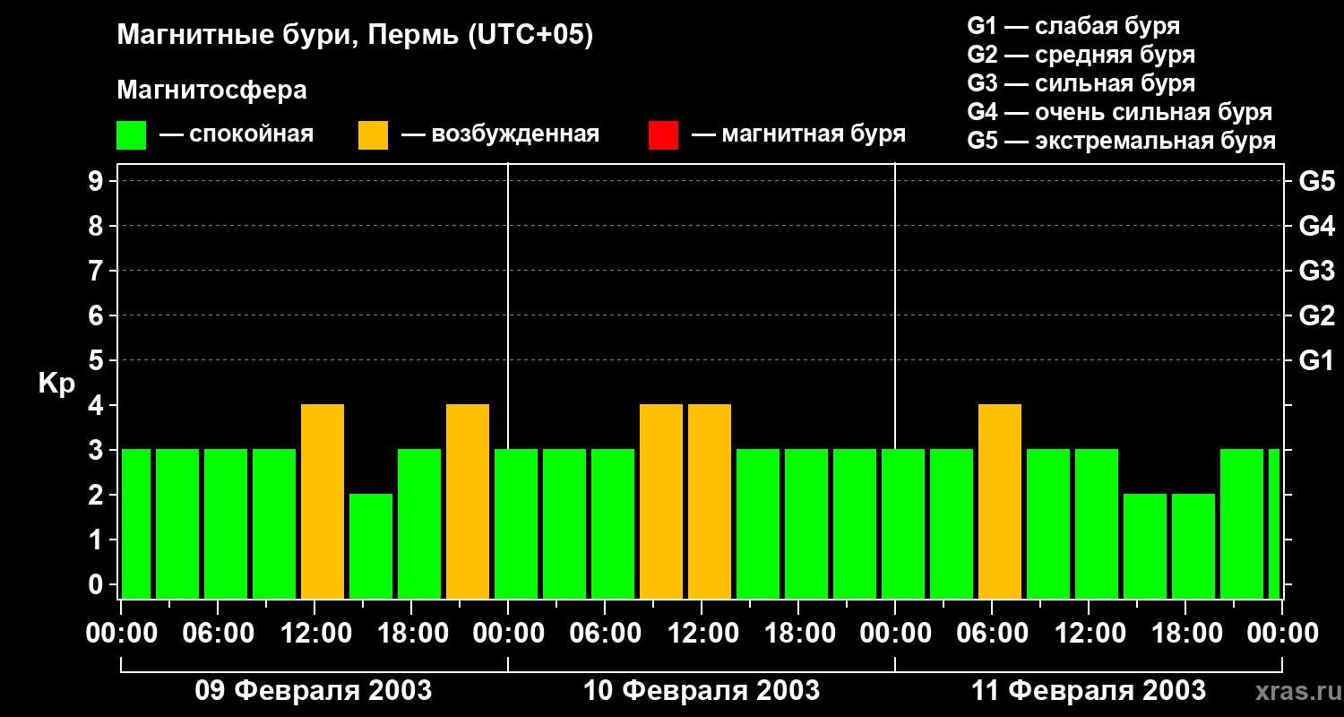 Изменения геомагнитного индекса Kp с 9 по 11 февраля 2003 года для средних широт