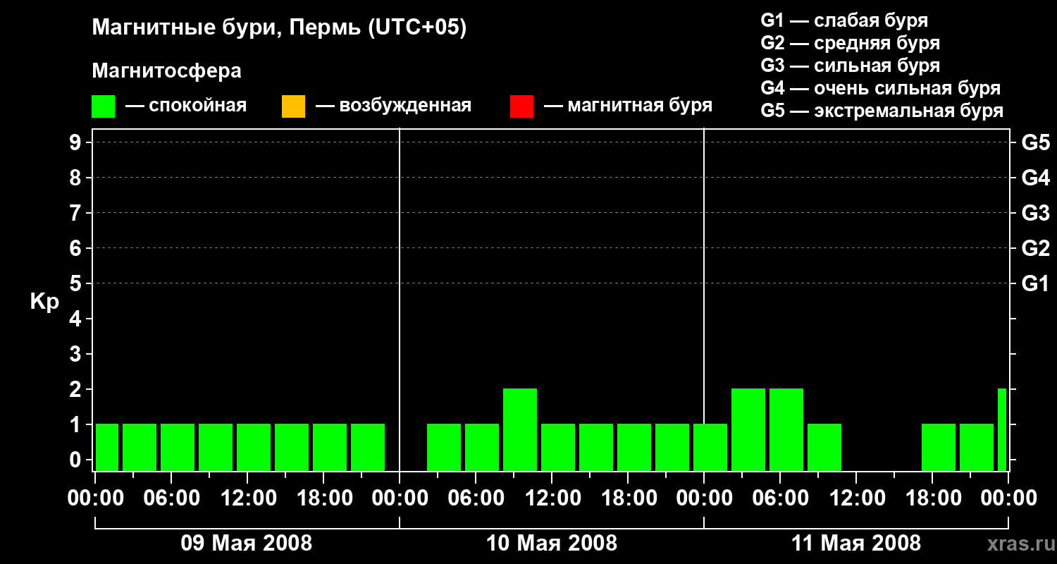 Изменения геомагнитного индекса Kp с 9 по 11 мая 2008 года для средних широт