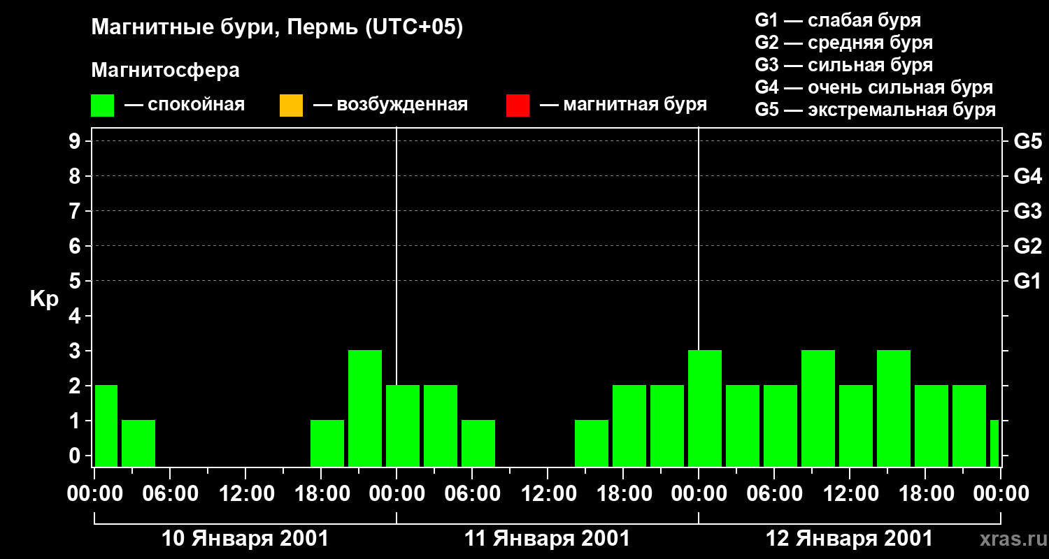 Изменения геомагнитного индекса Kp с 10 по 12 января 2001 года для средних широт