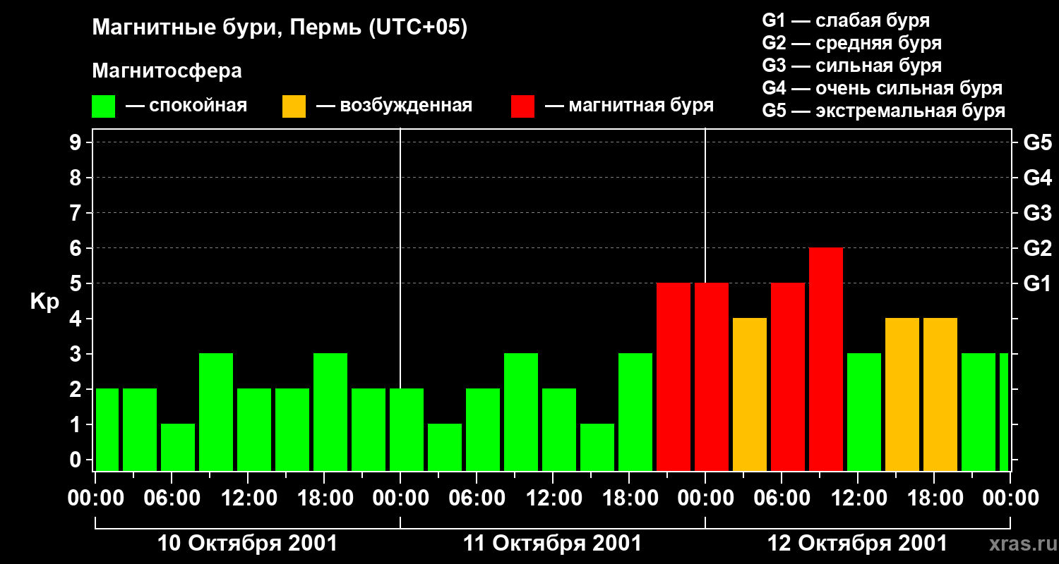 Изменения геомагнитного индекса Kp с 10 по 12 октября 2001 года для средних широт