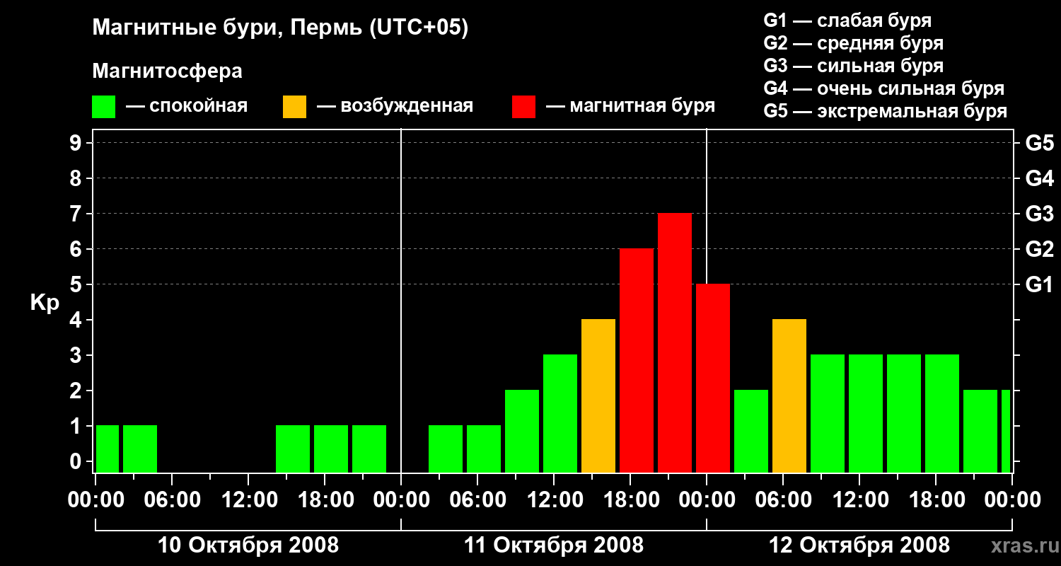 Изменения геомагнитного индекса Kp с 10 по 12 октября 2008 года для средних широт