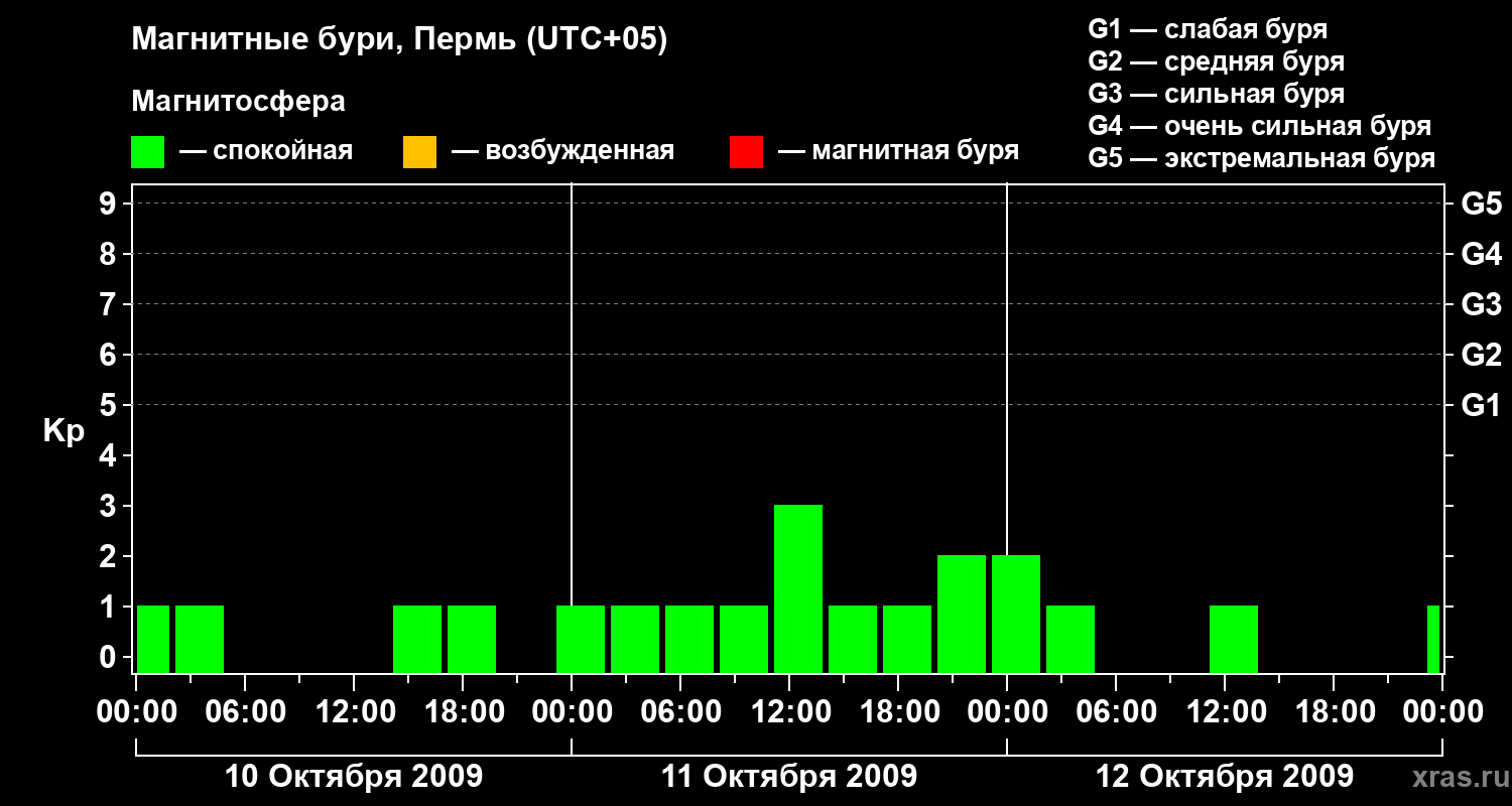 Изменения геомагнитного индекса Kp с 10 по 12 октября 2009 года для средних широт