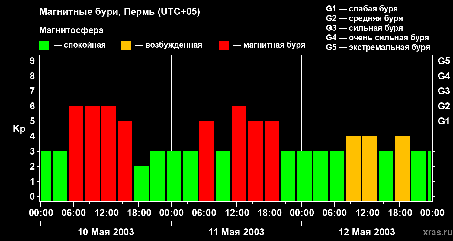 Изменения геомагнитного индекса Kp с 10 по 12 мая 2003 года для средних широт