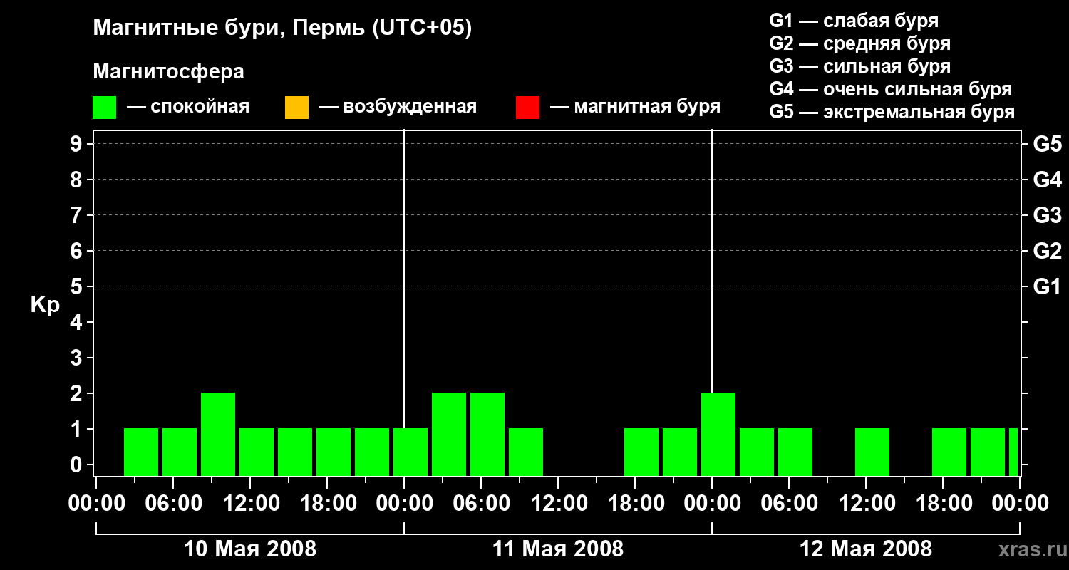 Изменения геомагнитного индекса Kp с 10 по 12 мая 2008 года для средних широт