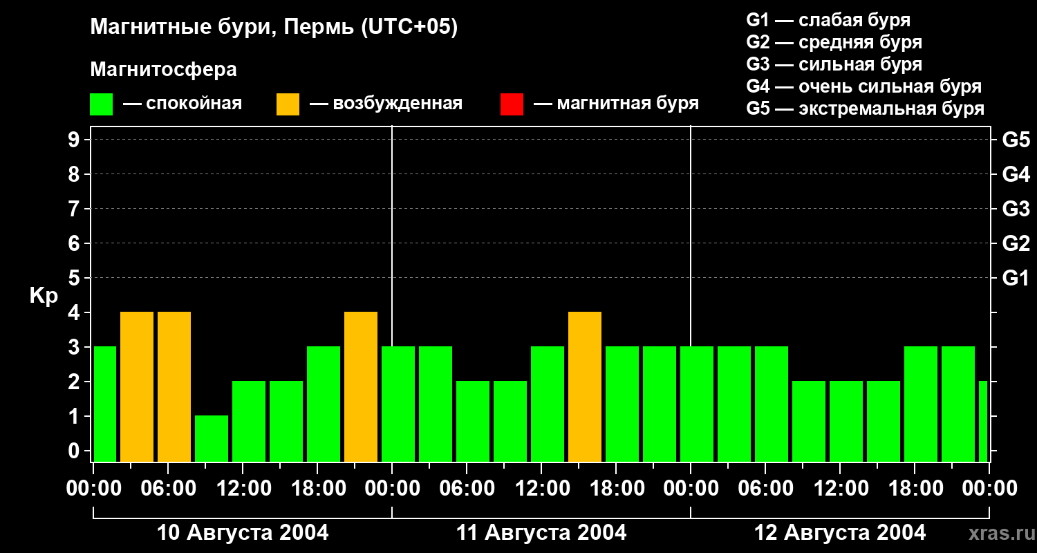 Изменения геомагнитного индекса Kp с 10 по 12 августа 2004 года для средних широт