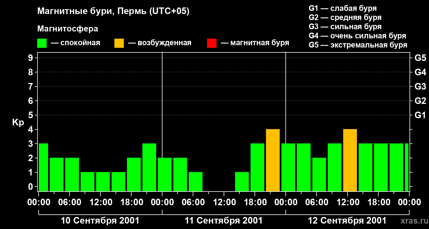Изменения геомагнитного индекса Kp с 10 по 12 сентября 2001 года для средних широт