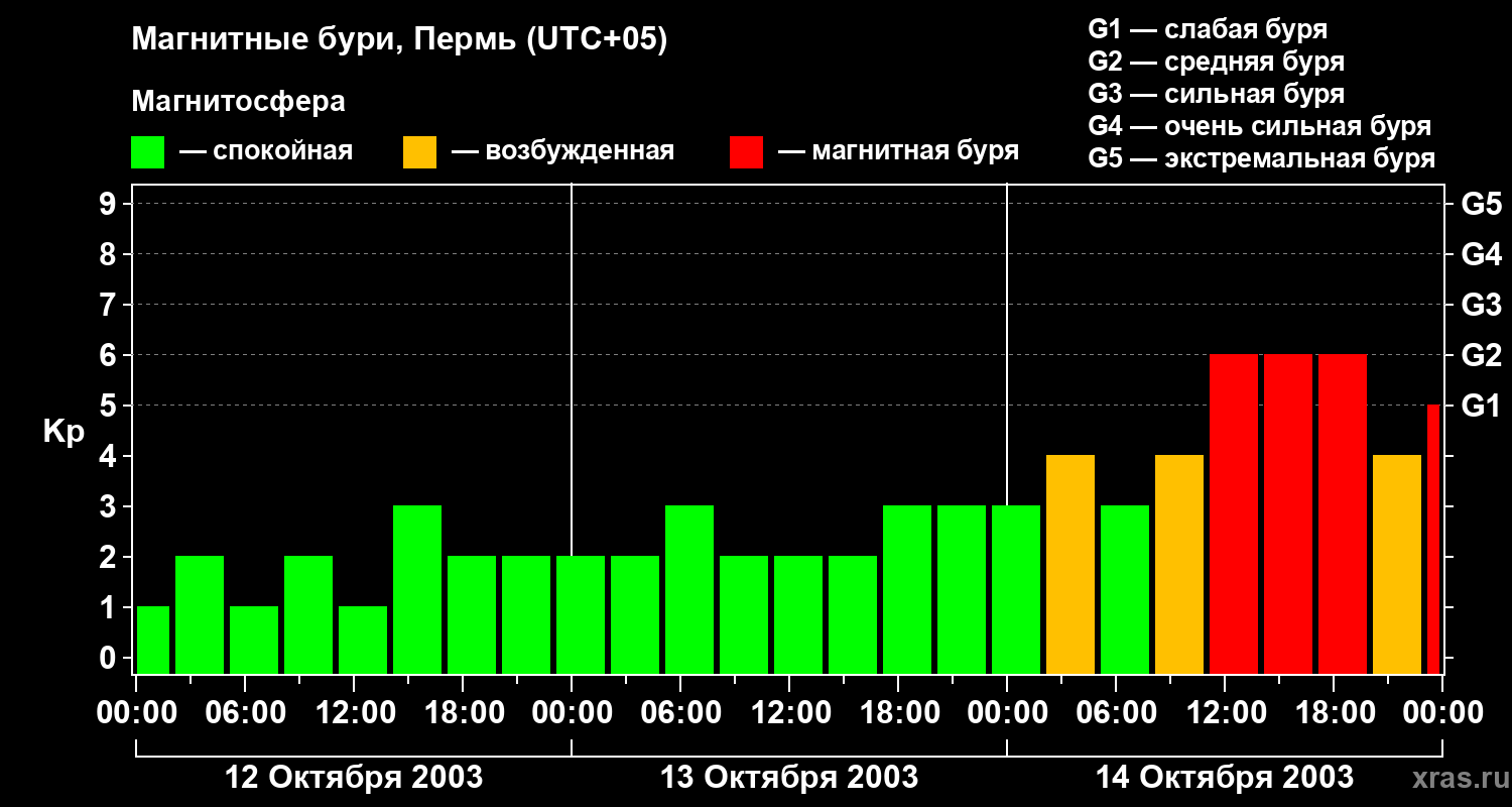 Изменения геомагнитного индекса Kp с 12 по 14 октября 2003 года для средних широт