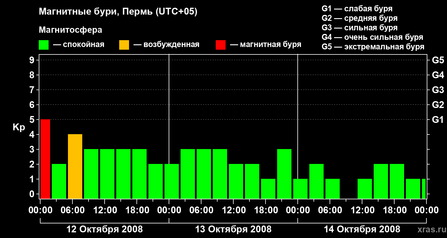 Изменения геомагнитного индекса Kp с 12 по 14 октября 2008 года для средних широт